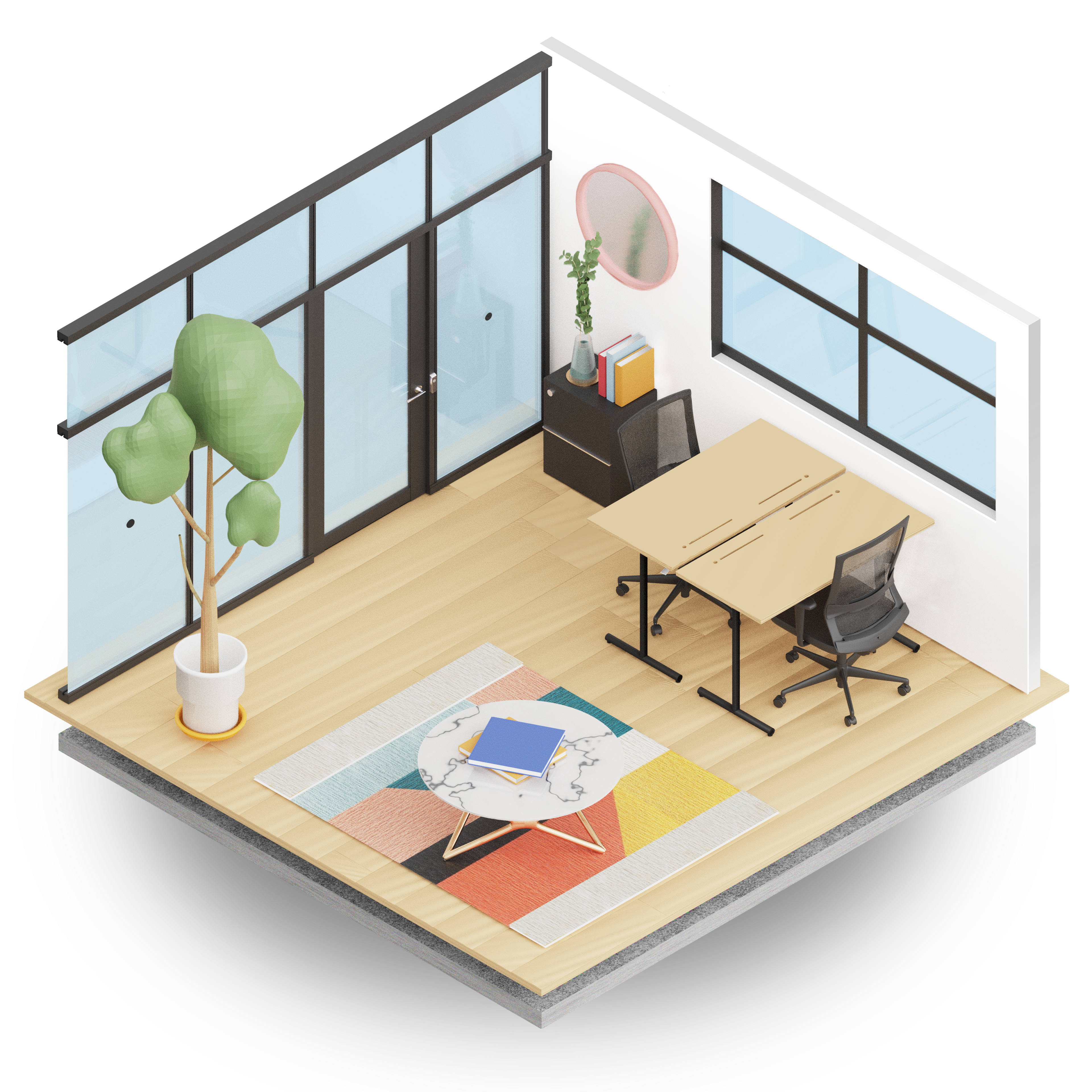 Desk space in a lockable office, with 24/7 access to premium amenities and conference rooms.